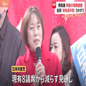 共同通信「自民単独過半数か… 中道、議席減…」