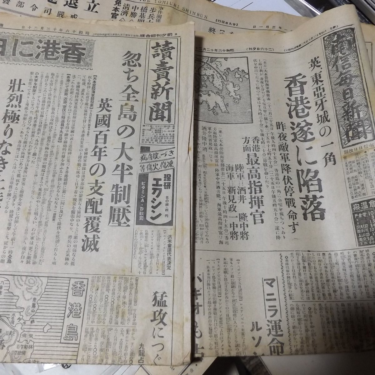 「香港遂に陥落」(長野・南信毎日新聞、昭和16年12月27日)「香港に日章旗翻る」(読売新聞、昭和16年12月20日)