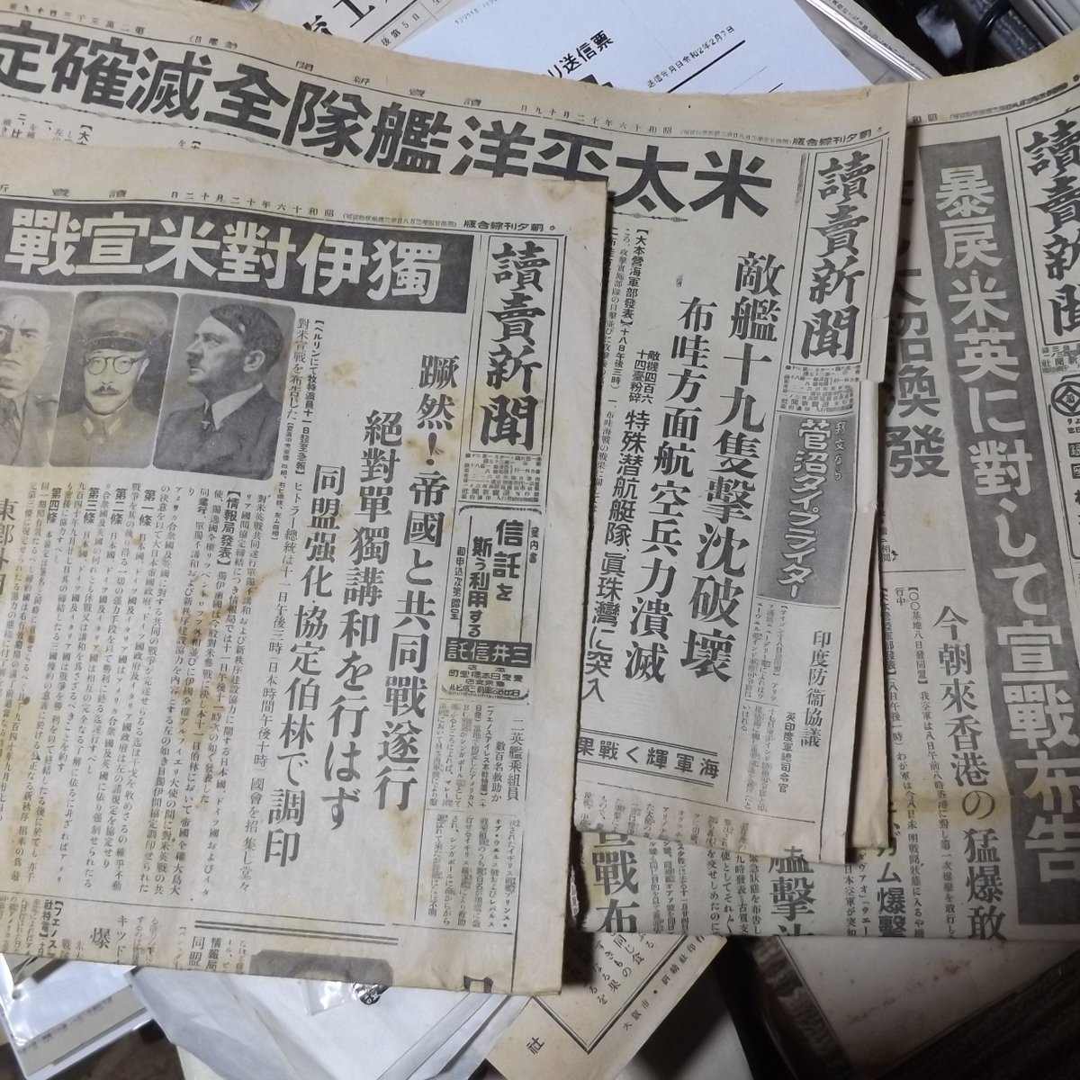 「暴戻米英に対して宣戦布告」(昭和16年12月9日)「米太平洋艦隊全滅確定す」(昭和16年12月19日)「独伊対米宣戦」(昭和16年12月12日)