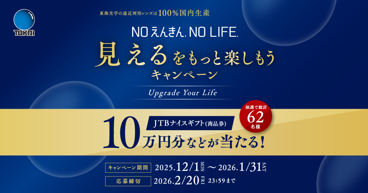 東海光学キャンペーンNOえんきん.NO LIFE 『見えるをもっと楽しもう』キャンペーン 期間 2025.12.1(月)〜2026.1.31(土)までのご注文分 応募締め切り 2026.2.20(金) 当日消印有効/WEB23:59まで 対象商品 累進レンズ/アイアシストレンズすべて キャンペーン期間中に対象商品をご購入いただいた方の中から 抽選で素敵な賞品が当たります 詳しくは下記のリンク先でご覧ください 見えるをもっと楽しもうキャンペーン|東海光学対象商品をご購入&ご応募いただいた中から抽選で素敵な賞品プレゼント!|NO えんきん NO LIFE.tokaiopt.jp