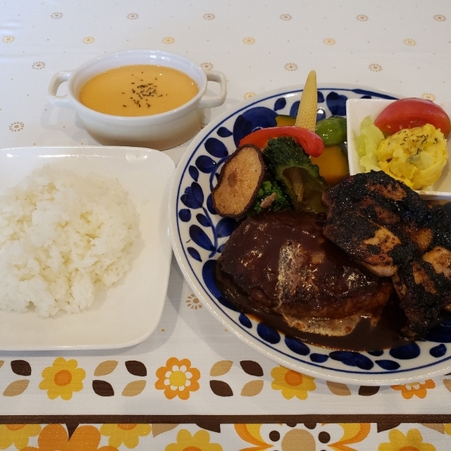 小浜のお友達と隣町へランチにいってきました。友達ナビに従って運転していくと国道から離れた山のほうの住宅街にあるレストランへたどりつきました。和風住宅の外観からは想像がつかない明るくて開放的なインテリア。パステルカラーの壁紙がとてもかわいい。アメリカの西海岸のおうちを連想するような感じでした。現在はハンバーグをメインにしたメニュー数種類で営業されているようです。