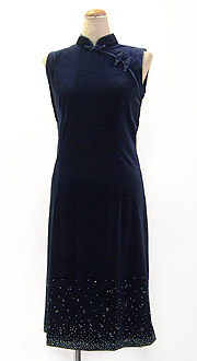 しなやかな肌触りが魅力のベロア地でチャイナドレス風の着やすいワンピースを作りました。伸縮性のある生地が大変着心地良く、女性らしいシルエットに仕上がっています。シンプルなデザイン+裾のラメペイントが上品な美しさ!オーガンジーなどのショールやボレロを羽織って、ぜひパーティーにお出掛けください。