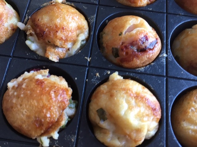 外皮がカリッとなってきたら、さぁ、たこ焼をひっくり返しましょう!