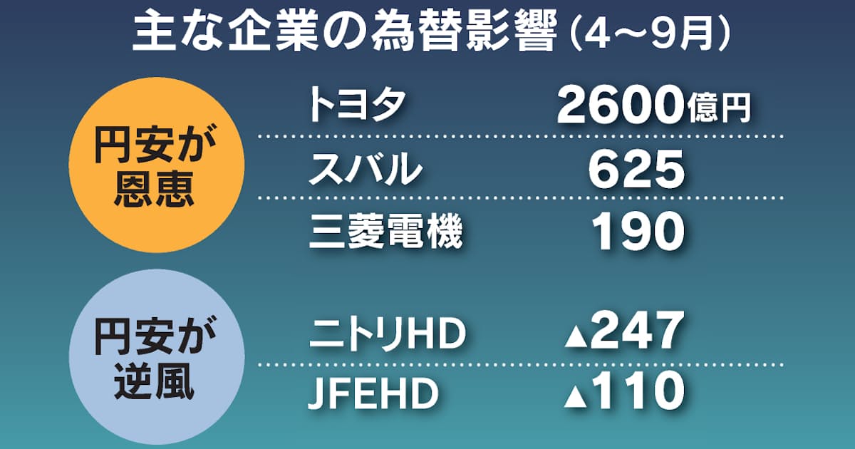 円安が企業業績を支えている。主要77社の2023年4〜9月期は前年同期比で約8100億円の押し上げ効果があり、過去最高だった営業利益の増加額の5割を占めた。海外生産が拡大し以前より為替の恩恵は減ったが、引き続き業績をけん引した