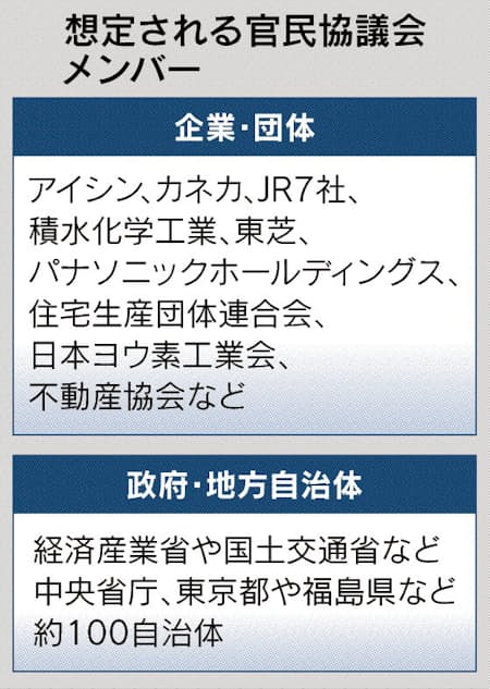 商用化に向けては積水化学や東芝などが開発に着手し、積水化学は25年の販売開始をめざしている。官民協議会には2社のほか、アイシンやカネカ、パナソニックホールディングスといった国内メーカー、JR7社、住宅・不動産などの業界団体、経産省や国土交通省などの中央省庁、100近くの地方自治体が参画する。