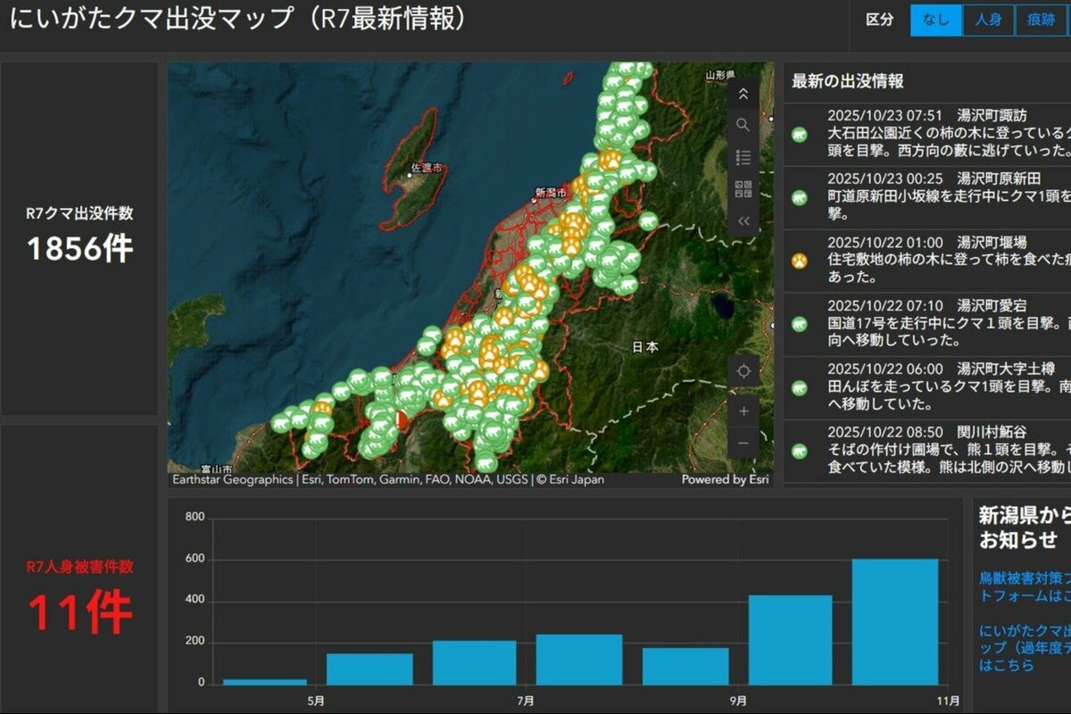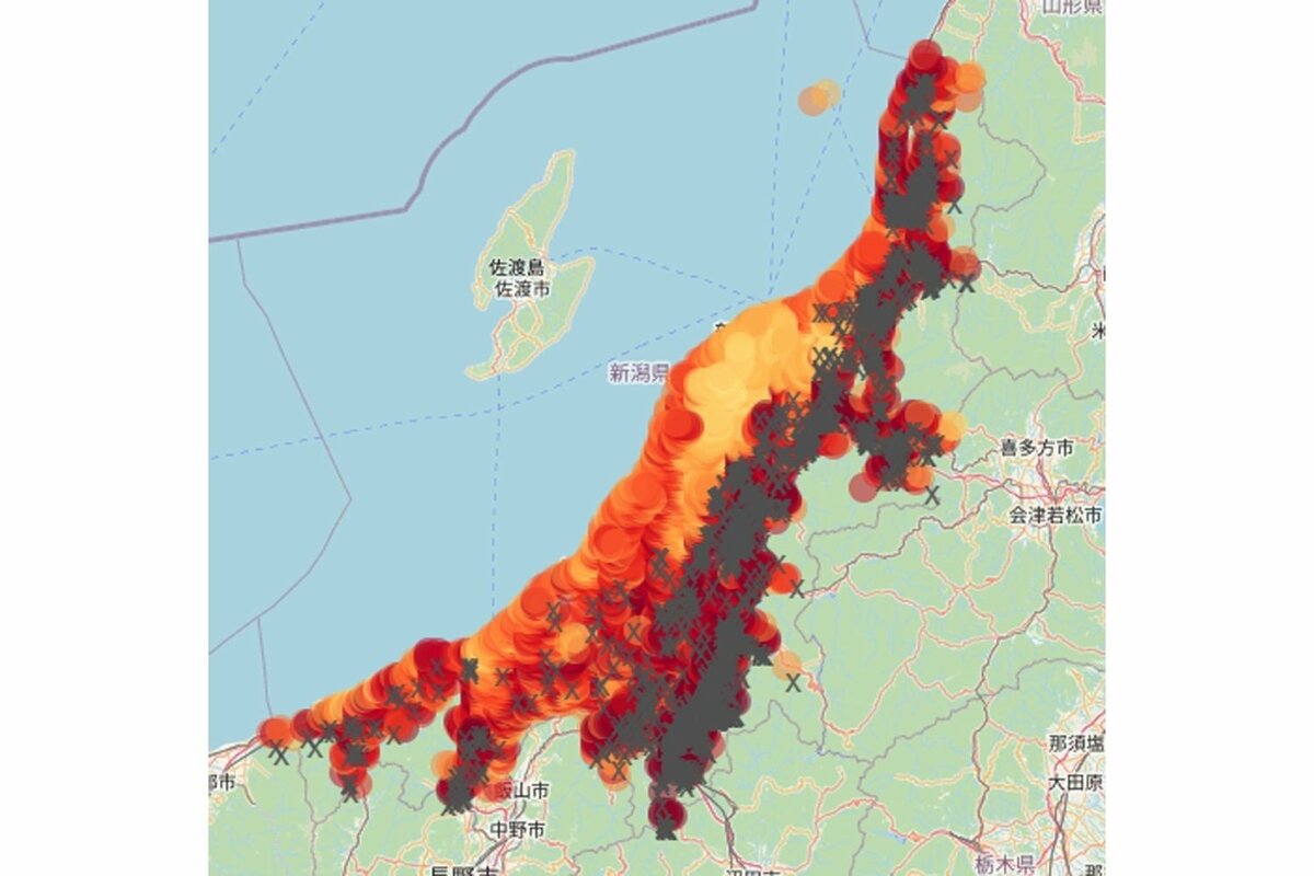 クマ出没マップhttps://www.niigata-nippo.co.jp/articles/-/729326クマ遭遇確率をAI予測、上智大が開発し公開 5段階で注意喚起 | 新潟日報上智大の研究チームは、札幌市や新潟県など19地域でクマと遭遇する確率を人工知能(AI)で予測した地図「クマ遭遇AI予測マップ」をウェブサイトで公開している。クマによる人身被害や市街地への出没が各地で相次ぐ中、住民や観光客、自治体など...www.niigata-nippo.co.jphttps://www.niigata-nippo.co.jp/articles/-/505843?utm_source=headlines.yahoo.co.jp&utm_medium=referral&utm_campaign=partnerLink新潟県作成「にいがたクマ出没マップ」 | 新潟日報マップを拡大すると、クマや足跡のマークが表示されます。マークはその年の大まかな目撃地点を示しており、クリックすることで出没した地区名や目撃時の状況などを見ることができます。[関連記事]クマ各地で出没中…www.niigata-nippo.co.jp(・Д・)(・•・)佐渡には渡れないのかあクマでも〜(・◇・)