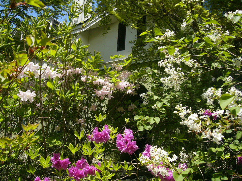 森の家冬の景色とは一変して、花葉の茂みにおおわれて、建物を隠します。 昔のオープン当初、とてもとても外構工事(庭木)には、手が回りませんでしたが、東京の仲間が軽井沢から、せっせと珍しい樹木を運び植えてくれました。周囲からは、お化け屋敷。と、囁かられたのですが、今となれば、ライラックが、ツツジが、ヤマボウシが訪れる人の目を楽しませてくれます。