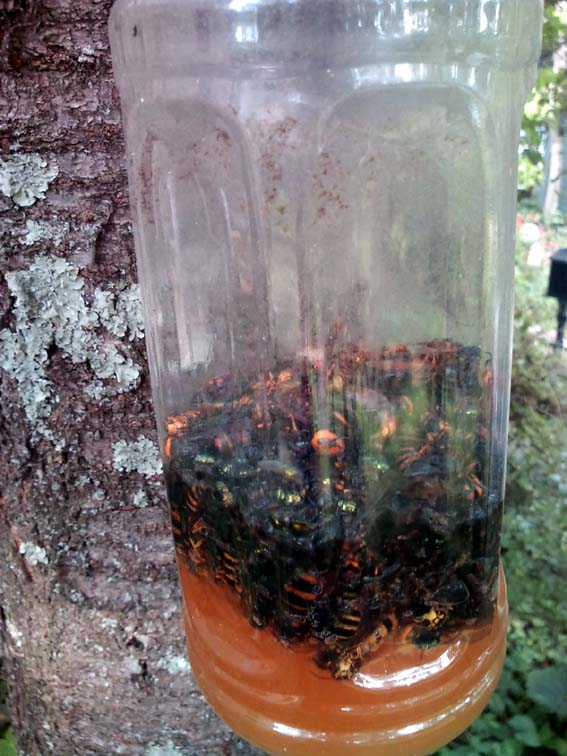 スズメバチを予防・退治例年より早く、スズメバチを退治する薬をペットボトルに入れた。まぁ何と早くもこんなに入りました。スズメバチの巣を業者に頼めば2万円は掛かります。これですと百円です。調合は、酒5・酢3・砂糖2です。
