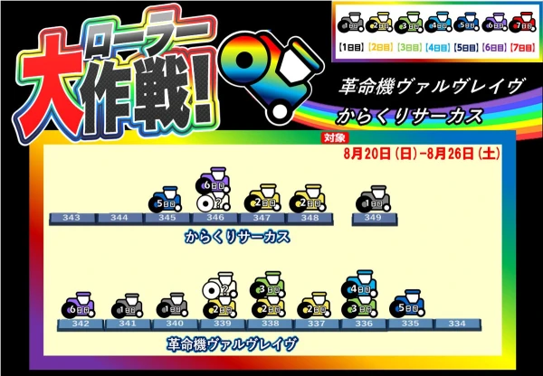「ローラー大作戦」⑥日目は「ヴヴヴ」342番台、「からくり」346番台と予想。前日は⑤日目で末尾⑤に仕掛けられたということでこの日も同様に⑥日目に合わせて末尾⑥の346番台に仕掛けてきたと予想します。同じく末尾⑥の「ヴヴヴ」336番台に関しては回転数が少ないため出玉優秀な342番台をピックアップしました。