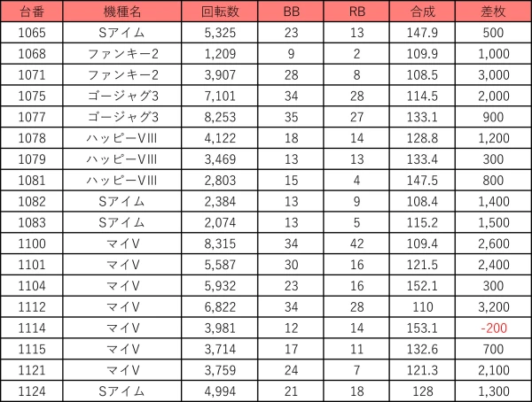 | 台番 | 機種名 | 回転数 | 差枚 |