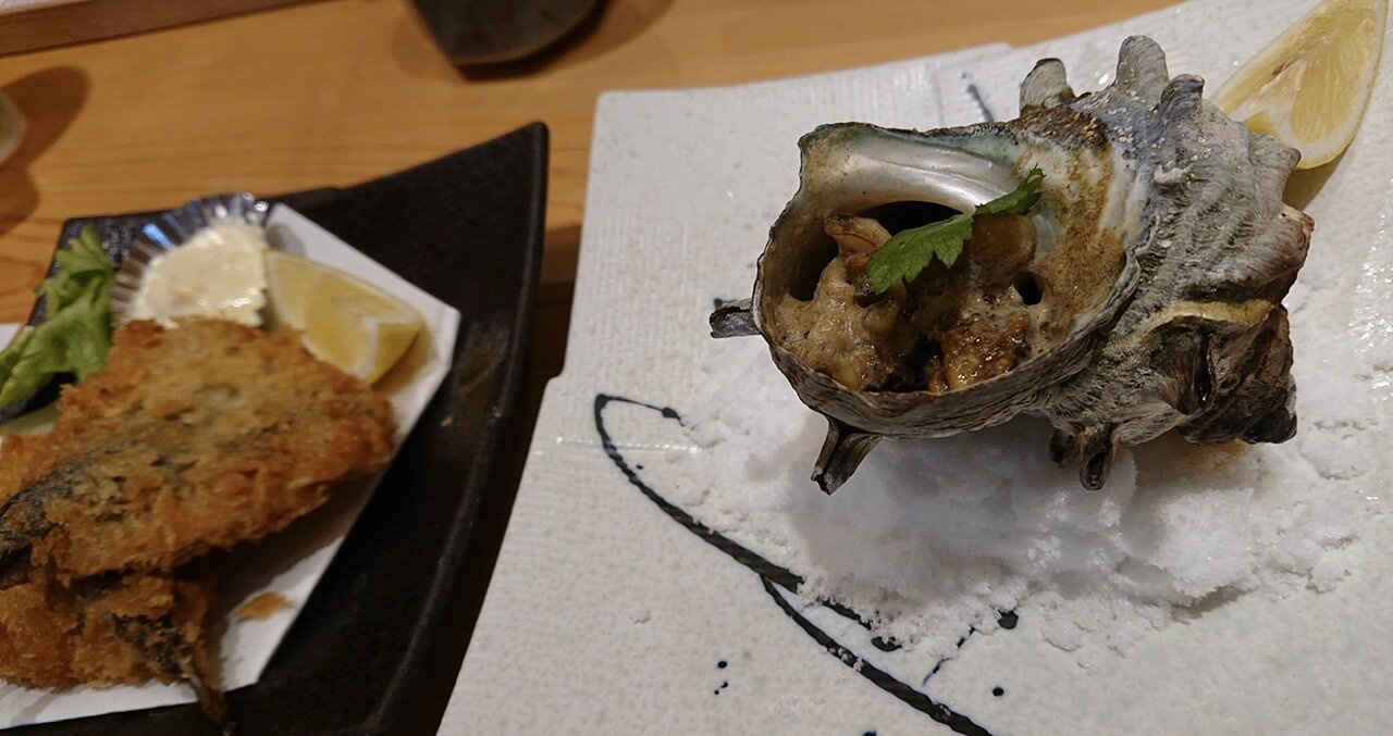 サザエの壺焼きとアジフライ