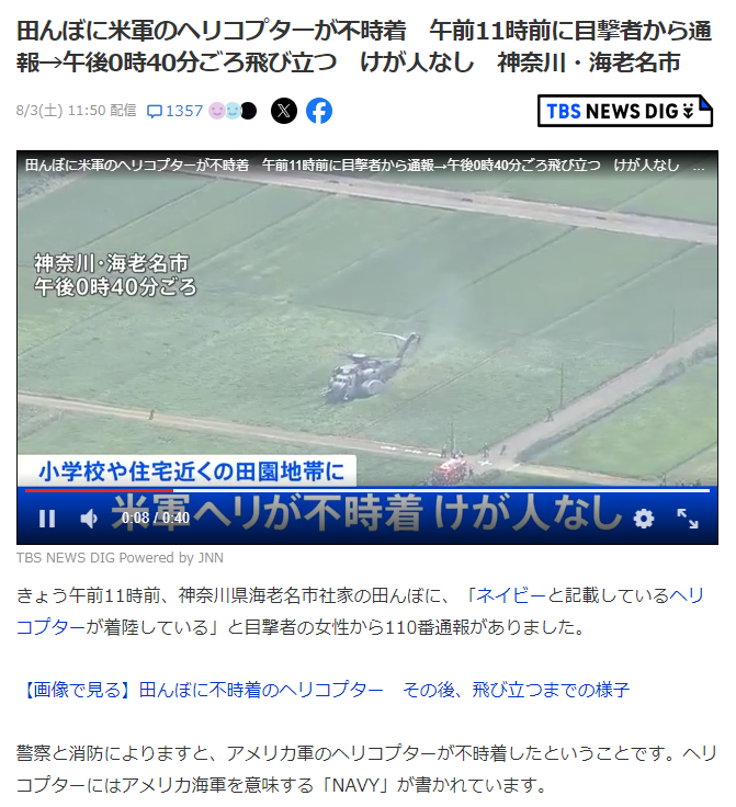 「米軍ヘリが田んぼに不時着」