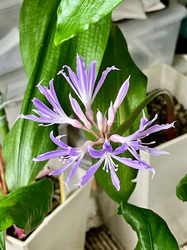 グリフィニア・エスピリテンシス ssp. バイーアーナグリフィニア・エスピリテンシス ssp. バイーアーナ Griffinia espiritensis ssp. baiana が咲きました。 ブラジル連邦共和国原産のヒガンバナ科植物。 バイーア州の海岸林に生えているものだそう。 ふつうのエスピリテンシスはリボニアーナとおなじような葉で斑が入らないだけですが、この種類は葉が広いのが特徴です。 リボニアーナすらまともに咲かないほど適当な栽培なのに、なぜかこの種類は毎年かならず花を咲かせてくれます。 でも、分球しない、実をつけない。