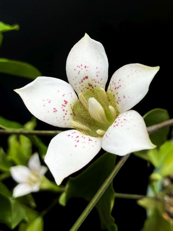 ロスマニア・アンネロスマニア・アンネ Rothmannia annae が咲きました。 セーシェル共和国原産のアカネ科植物。 IUCNレッドリスト 絶滅危惧種 セーシェル共和国のアリッド島だけに自生する植物。 タネから栽培しているけれど、本物かどうかは不明。 親株や挿し木株が毎年花を咲かせているけれど、特徴的な赤紫色の模様がなぜか年々少なくなっていき、昨年はついに真っ白な花になってしまいました。 今回、ちゃんと模様の入った花を咲かせたのは挿し木で増やした別の初めて咲いた株。 これからも模様の入った花が咲けばいいんだけれどね。