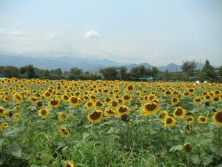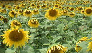 ひまわり キク科の一年草。 観賞用に栽培される他に、種は食用になり、油もとれる。 ひまわりの語源は日廻り、日を追いかけて回るという意味がある。 実際に若い茎や、咲き始めの花は太陽を追って回る。 しかし、花がよく開いた後は動かなくなり、多くの花は東向きに咲く。 だから、写真の様なひまわり畑に咲く ひまわりの群れは、向きが一緒になると思います |