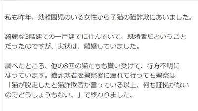 囮に先住猫がいる場合も。譲渡の時に知人の家を借りる輩さえ。