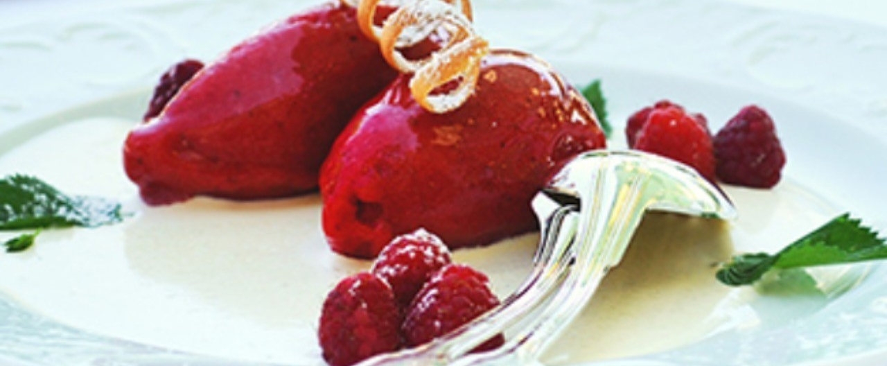 フランボワーズとココナッツのドームに、シャーベットは南国フルーツライチ。