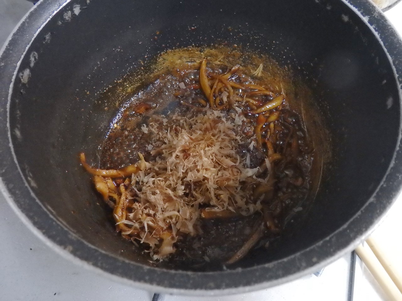 4、汁気が減ってきたらかつおぶしをいれ、弱火で1~2分混ぜ合わせるように煮る。