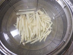 2、2mm程度のせん切りにしたあと、さっと水にさらし、水気を切っておく。