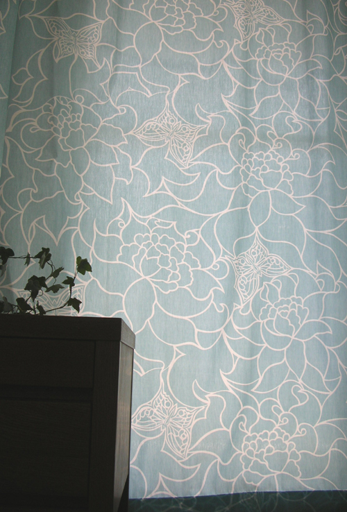 リビングに 新しいカーテンを取り付けました。 以前、仕事でカーテンの発表会に行ったとき一目ぼれした、マリメッコのカーテンです。 大胆な花柄とキレイなブルーに惹かれ、いつか自宅にと思っていました。 マリメッコというと、赤や黄色の定番の花柄を思い浮かべる人も多いと思いますが、 他にも花や植物をモチーフにした生地がたくさんあります。 植物のモチーフが好きな私にとって、マリメッコの生地はどれも素敵で憧れです。