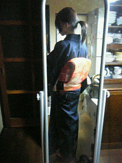 花嫁修行(9)着物の着付け教室第5回 花嫁修行というよりもただの趣味と化してきた着付け教室… 殿方からは「着るものよりも料理しろ!!」という声が聞こえてきそうな今日この頃 ←自分で着たにしてはなかなかじゃない?? 帰って復習してのを撮ってみた…鏡にうつってるのを撮ったので見にくいのはご勘弁を 借り物なんで若干着にくいんですけどね…とか言い訳もしておきます ちなみにこれが「二重太鼓」です招待状作成中途半端のまま進まず…明日こそは…