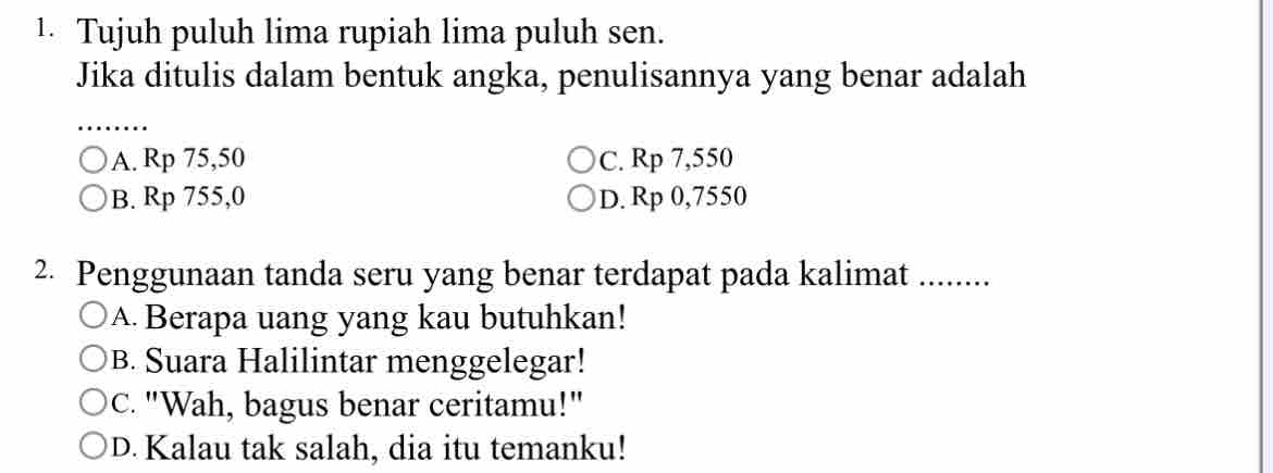 1. Tujuh puluh lima rupiah lima puluh sen. Jika ditulis dalam bentuk angka, penulisannya yang benar adalah
