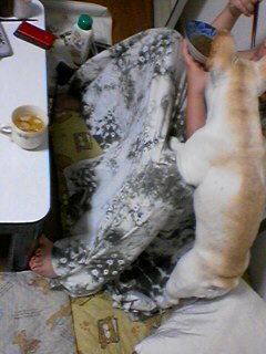 ぺーちゃんは、いつも器用に掛け布団から顔をだして、私の足下で寝ています。