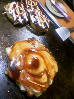 出来上がり~(^_-)-☆仕上げにソースとからしをのせて出来上がり!!・・・食してみる。うま~いっ!!生地はふわふわ、具のチーズとモチがなかなか固くなりません\(◎o◎)/!大阪最高っ!!ちなみに左上のはあゆさんの。