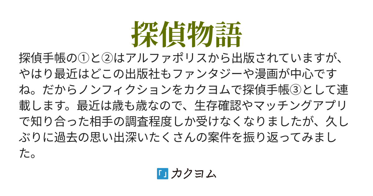 KADOKAWAさんのカクヨムで、探偵手帳③として連載をしています、本日「ある一家の行方を追って」の第四話をアップしています、よろしくお願いします👍
