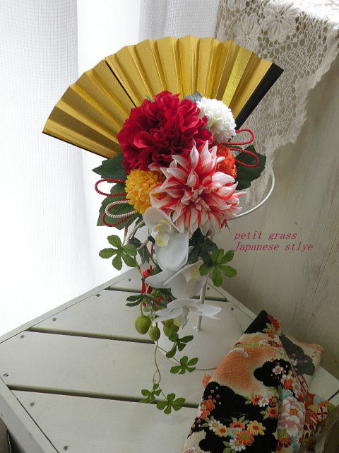 たっぷり開いた金扇子に、紅白のダリアを縁起よくデザイン