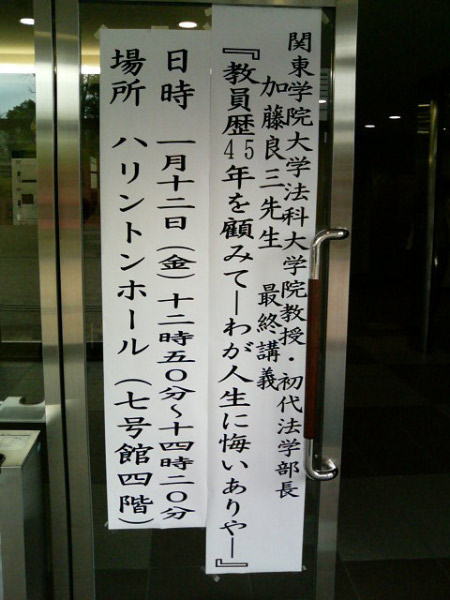 加藤良三先生最終講義昨日は、関東学院大学元法学部長の加藤良三先生の最終講義が同大小田原校舎で開催されました。今年77歳になられるそうですが、力強い講義を久しぶりにお聞きすることが出来ました。講義を受ける方で大学に行くのは久しぶりで、図書館も殆ど素通り。久しぶりにの図書館は、あれもこれも読みたくなり、沢山コピーして帰ってきました。昔を思い出したのと、あのころは毎回図書館で資料をあさり、勉強したのにと・・・反省