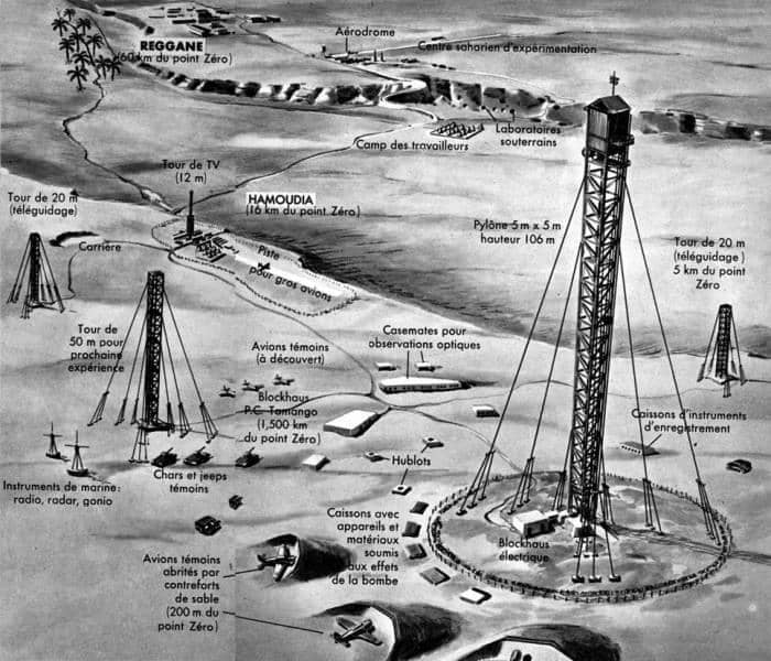 1960年 アルジェリアで長崎原爆の3倍の核実験を行い、在アルジェリア・フランス軍とアルジェリア軍に撤退のための「猫だまし」効果を狙う。