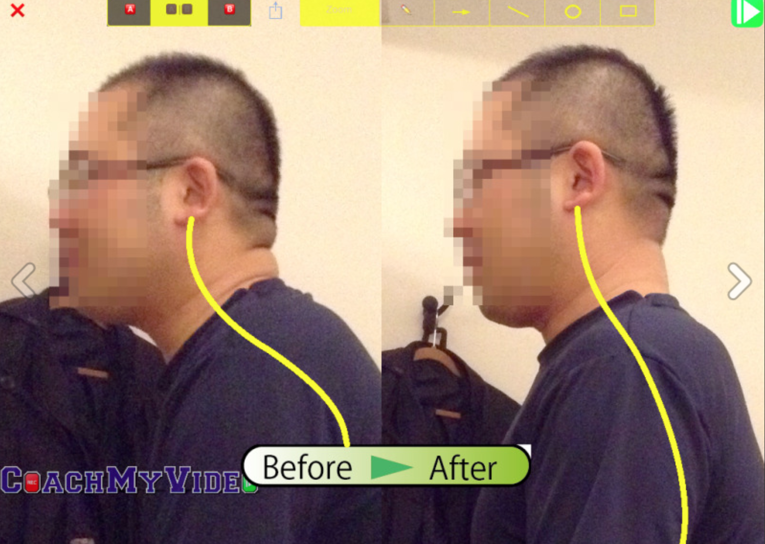 腰の丸みを補って、首の反りが過剰な状態。
