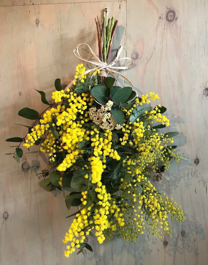 今回のお花は、ミモザがメインらしく、それにユーカリとか、名前忘れちゃったけど、ピンクや白のお花、そしてゼンマイなんかを束ねました。