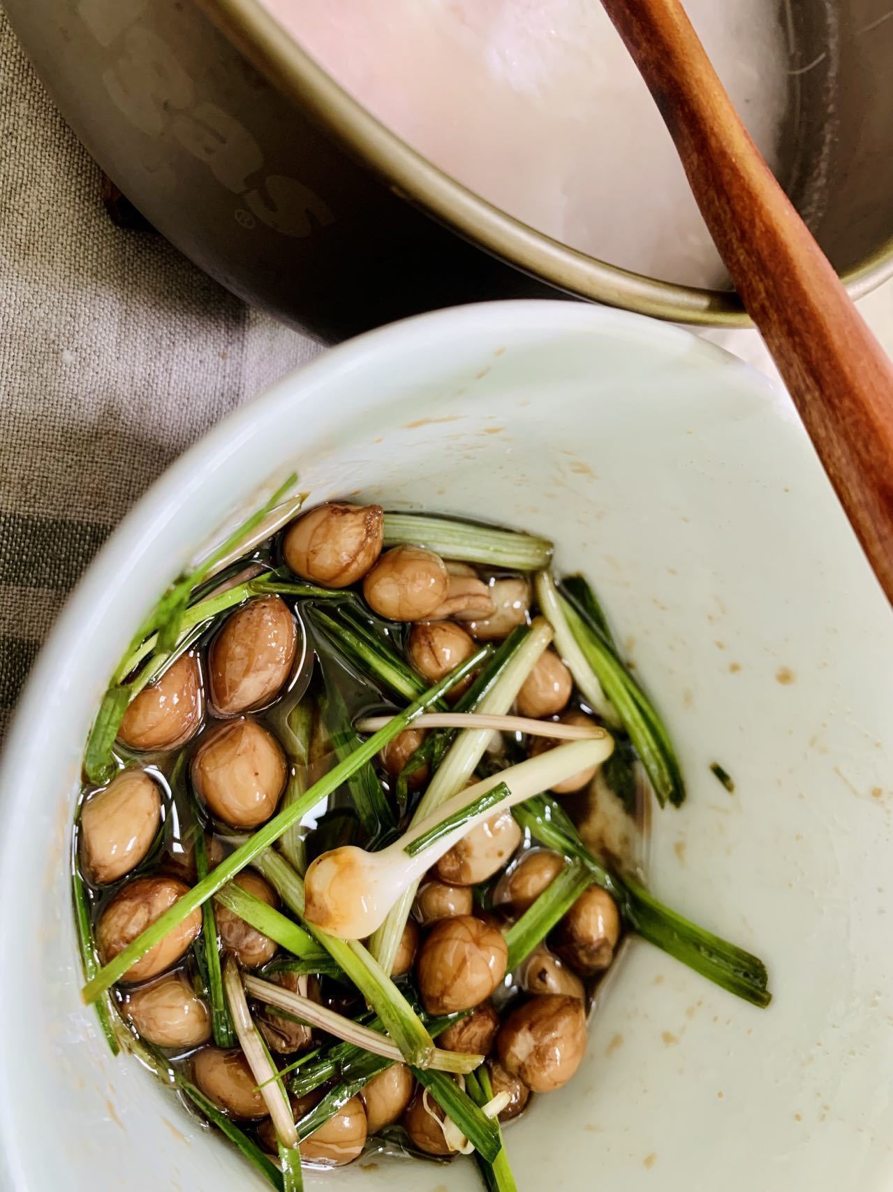 近所の道端に野蒜を発見、料理にした。WOW、美味しい~春の味~~黒酢漬けのピーナッツと一