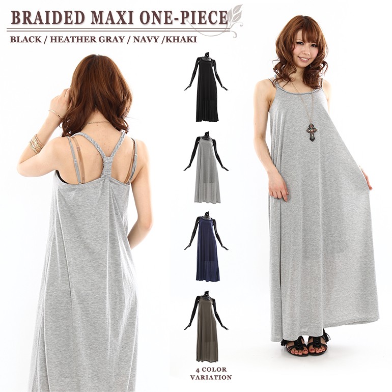 絶対お勧め!毎年大人気!夏の定番マキシワンピース。去年好評だった『三つ編みストラップ』がまた帰って来ました!三つ編みストラップはチラ見せとしても使える◎で、コーディネートのポイントになります。そして、今年のマキシは去年とは違います!!なんと!『ペチコート』が付いた2点セットにバージョンアップ!!超お買い得な2点セットのマキシワンピは、ブラック・杢グレー・ネイビー・カーキの4色ご用意しています(ペチコートはそれぞれのカラーと同色の2点セットになります)。販売価格:1,980円