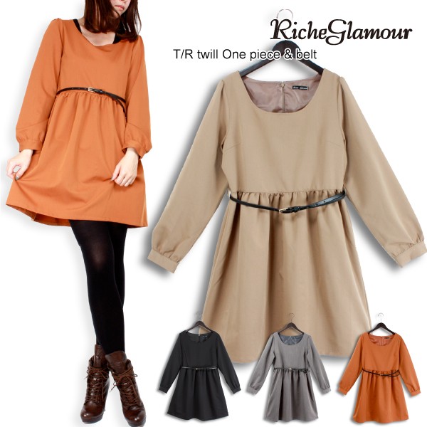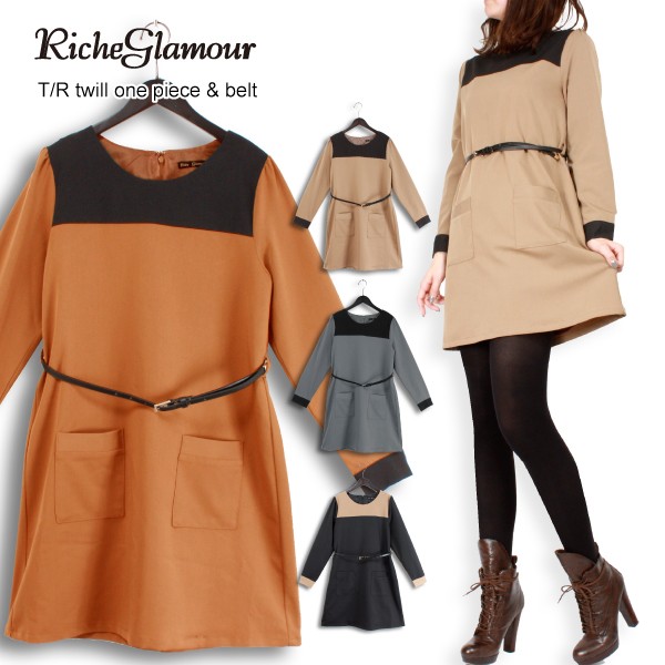 ベルト付きがポイント!可愛いワンピ☆ツイル素材のベルト付きダブルポケット・ワンピース☆人気のシルエットに加えて、ベルト付きが魅力◎ヨーク・袖口は同素材配色仕様です!トレンドを意識したカラー展開で、シンプルなデザインのワンピースです★(YKKジッパー使用、付属ベルト付き:カラーはブラック共通)(裏地付きです。)販売価格:2,680円