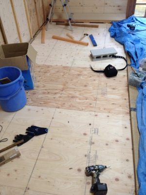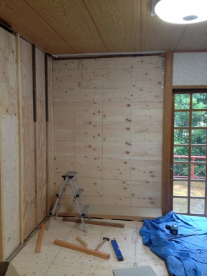 本日は新宴の壁の下地作りと合板張りを実施しました。