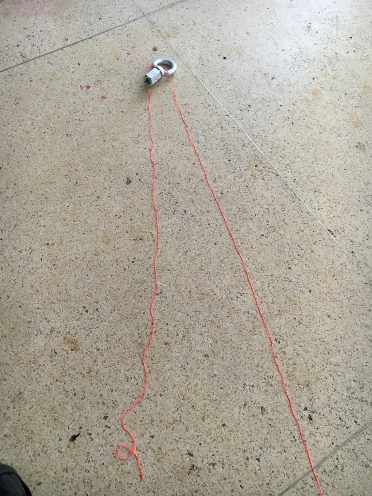 ②水糸の長いほうにロープを結んでくっつけます。