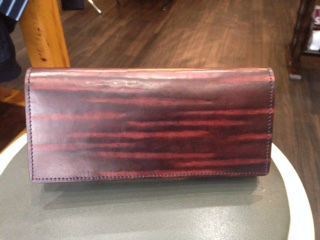 ムラサキとエンジの間のようなとっても上品なカラーでシワ加工が施された雰囲気抜群の仕上がりで、A様にとってもお似合いなお財布が完成致しました♪