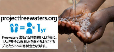 その名は「PROJECTFREEWATERS.ORG」です。 製品を一足買うと、1人が 安全な飲料水を一年間飲めるようにするプロジェクトへの寄付金となります。