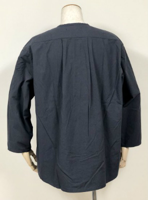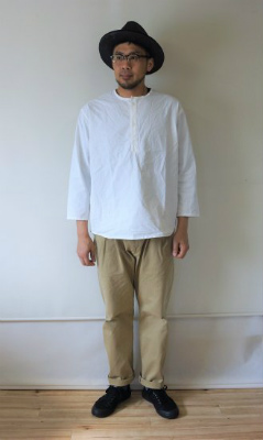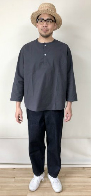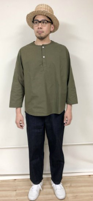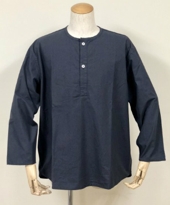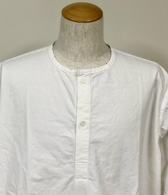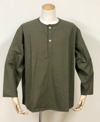シンプルなヘンリーネックのプルオーバーシャツでありながら、小さめなボタンが広めに間をとって二つ施されており、独特な首元の開きが楽しめます!