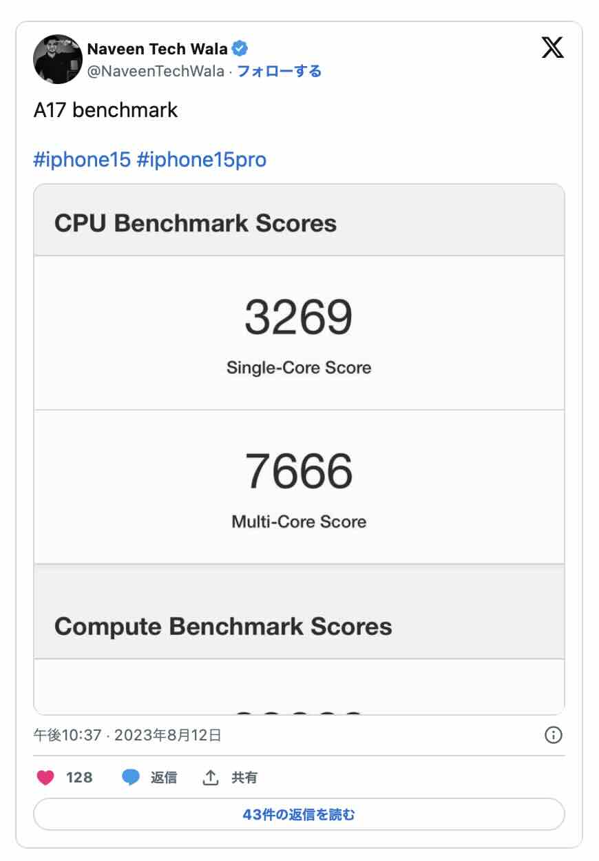 そこで、WCCFTechによると、そのA17チップのものとみられるGeekBenchのベンチマークスコアに関する情報がXに投稿されていることが分かりました。