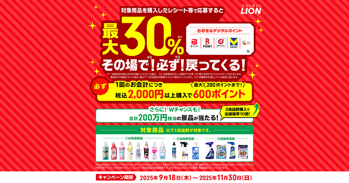 LION お洗濯・おそうじ用品購入で最大30%戻ってくる!さらにWチャンスも!【最大30%】ライオンお洗濯・おそうじ用品購入でデジタルポイントもらえる!今すぐ参加しよう!さらにWチャンス!1回のお会計で2商品群以上の購入で自動エントリー!合計200万円相当の景品が当たる!lsp-campaign.com
