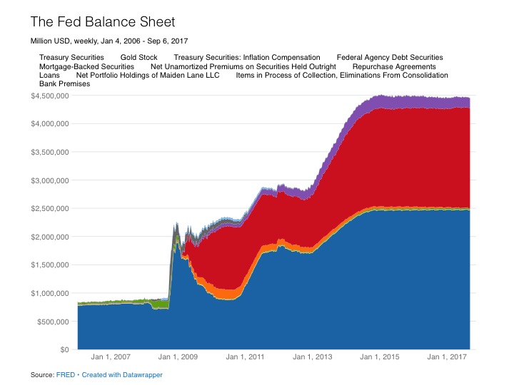 また、米国の中央銀行であるFRBが持つ米国債は、2.5兆ドル位である。中央銀行のバランスシートに関して、一言言及すると、住宅ローン債権などが多額含まれており、これも健全かどうか心配である。一番下の青い部分が財務省債権、赤い部分がmortgage-backed securities、つまりほとんど各種住宅ローン担保証券だと思う。FRBの資産圧縮が始まるが、この赤い部分を民間に売り渡すことだろうが、信用が十分あるのだろうか。