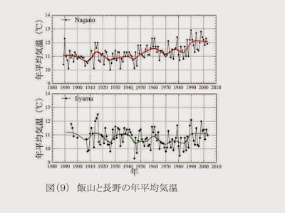 図(9)は、長野県の都市化が進んだ長野市と、都市化が進んでいない飯山市での約100年間の気温変化である。これは代表例で、他にも日本中の都道府県の都市化部と田舎部での気温データのペアが示されている。何れも都市部での温度上昇は、最近急に高くなっているが、田舎部では殆どコンスタントである。http://www.asahi-net.or.jp/~rk7j-kndu/kenkyu/ke04.html