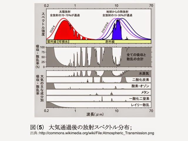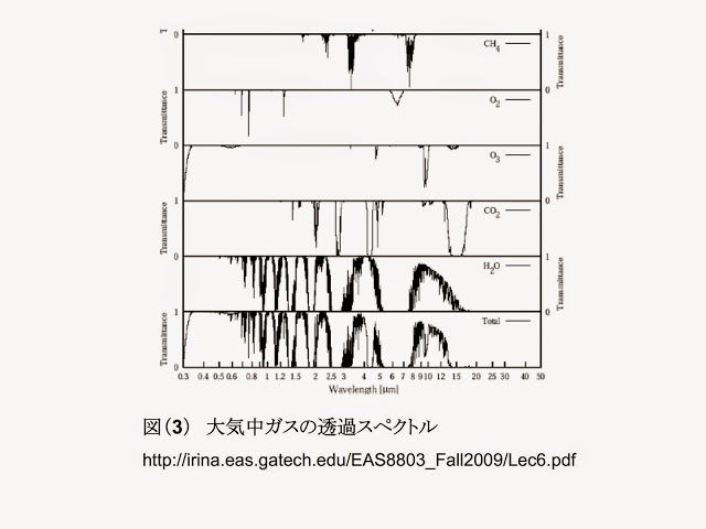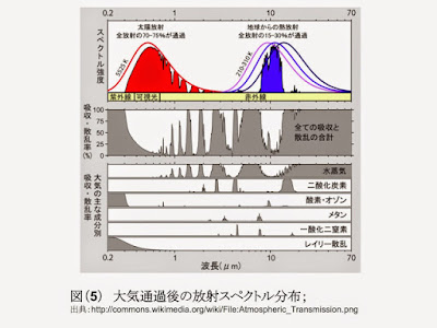 下図の7μから13μまでの凹んだ部分に対応する赤外線は能率良く宇宙に放射されていること、上図の凹んだ部分から、夫々水分子(7μ、13μ以上)、オゾン(10μ)、二酸化炭素(15μ)が、括弧内に大凡の波長でしめした領域の赤外線を宇宙に逃がさないようにしていることが解る。以上は、温室効果ガスが実際に地球の温暖化に寄与していることを示している具体的な証拠であり、重要な結果だと思う。 この図及びこの図の元になった図で気になるのは、横軸である。上図をよく見れば、横軸目盛として波長(μm)が書かれているが、等間隔でも対数表示でもない。そのこと及び縦軸の単位からも解る様に、波数(/cm)が横軸であった図を左右逆転して表示したものである。注意を要するのは、一般に波長を横軸に表現された放射スペクトルと振動数(波数)を横軸に表わしたスペクトルは、ピークの位置も形も異なるということである。(注5)横軸を波数で表示したのは、二酸化炭素の効果を大きく見せたいとの意図があったと思われる。地球からの輻射曲線のピークが、丁度二酸化炭素の吸収域に来るからである。 この図を見て、二酸化炭素の重要な役割を感じるが、定量的議論がなければ近年の地球気温の温度上昇の機構だという決定的証拠にはならない。