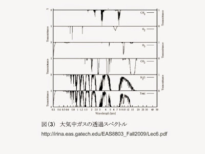 2)一方、二酸化炭素は上空での温暖化ガスとして主役である可能性が高いこと。つまり、低温でもガス状態であり、上空に達することが可能であること、及び、低温状態の大気は主として10-15ミクロン付近の赤外線を出して冷却するが、その部分に吸収を持つ二酸化炭素は、相応の温室効果を示すだろう。