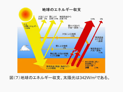 ここまで、IPCCの主張する人工的に放出された二酸化炭素などによる、追加的な地球温暖化とそのメカニズムを、太陽光の入射スペクトル、大気の吸収による地上でのスペクトル、そして、人工衛星で観測した上向き及び下向き放射のスペクトルなどから、考察した。ただ、実際に二酸化炭素などが地球の温暖化に著しく影響しているかどうかは、定量的な議論がなくてはならない。そこで、以下にエネルギー収支の問題を既存の図などを用い考えてみる。
