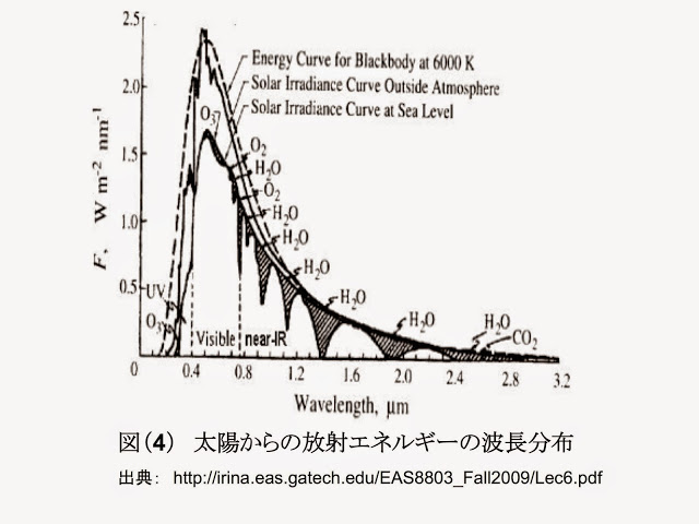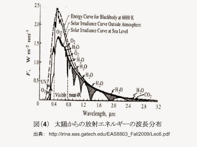 図(4)は同じくSokokik教授の講義(講演)資料からとった、太陽からくる放射エネルギーの波長依存性である。破線で示したのが、6000K(絶対温度6000度;摂氏5700度)の黒体放射スペクトルである。上の実線が大気圏外でのスペクトルで、その下が地表でのスペクトルである。紫外線部分が削られているのはオゾン層での吸収だろう。斜線により影をつけた部分は、大気内のガスによる吸収で減少したエネルギー部分である。当然、そのガスは上空で加熱されることになる。 ここでは波長2.5ミクロンまでしか書かれていないので、太陽エネルギーの大部分は可視光線と波長の短い赤外線(近赤外線)であることが解る。ここで注目したいのは、水による近赤外線の大きな吸収である。地上に来るまでに、おそらく15%(後に上げる図で、全大気による吸収は約16%)くらいは吸収されている。